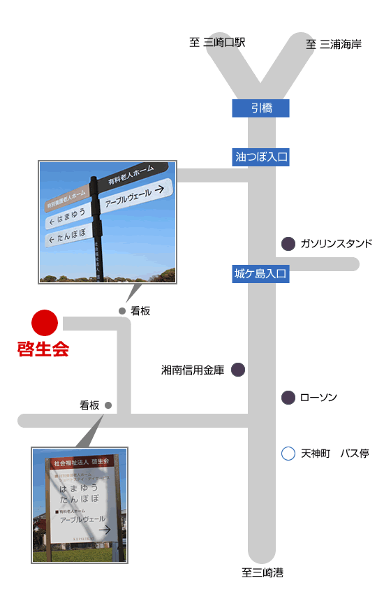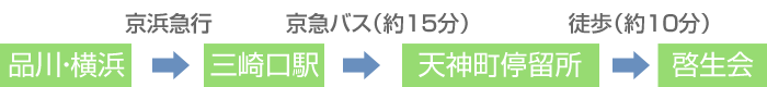京浜急行バス「三崎口」バス停2番乗り場より乗車「天神町」バス停車下車、徒歩10分