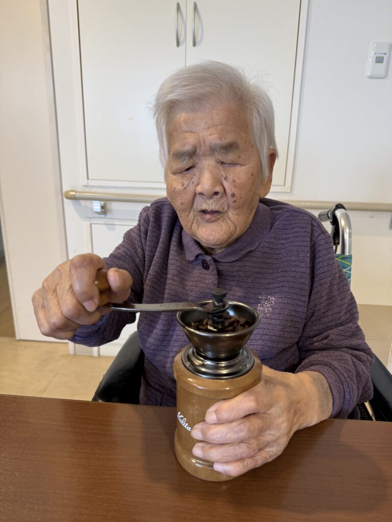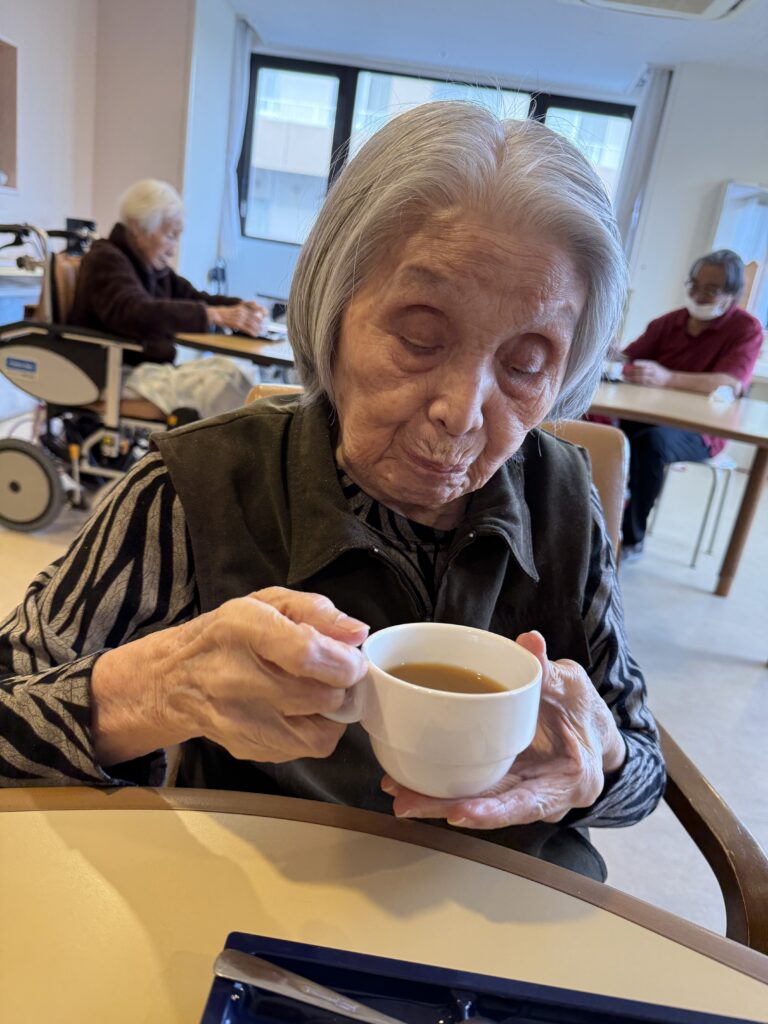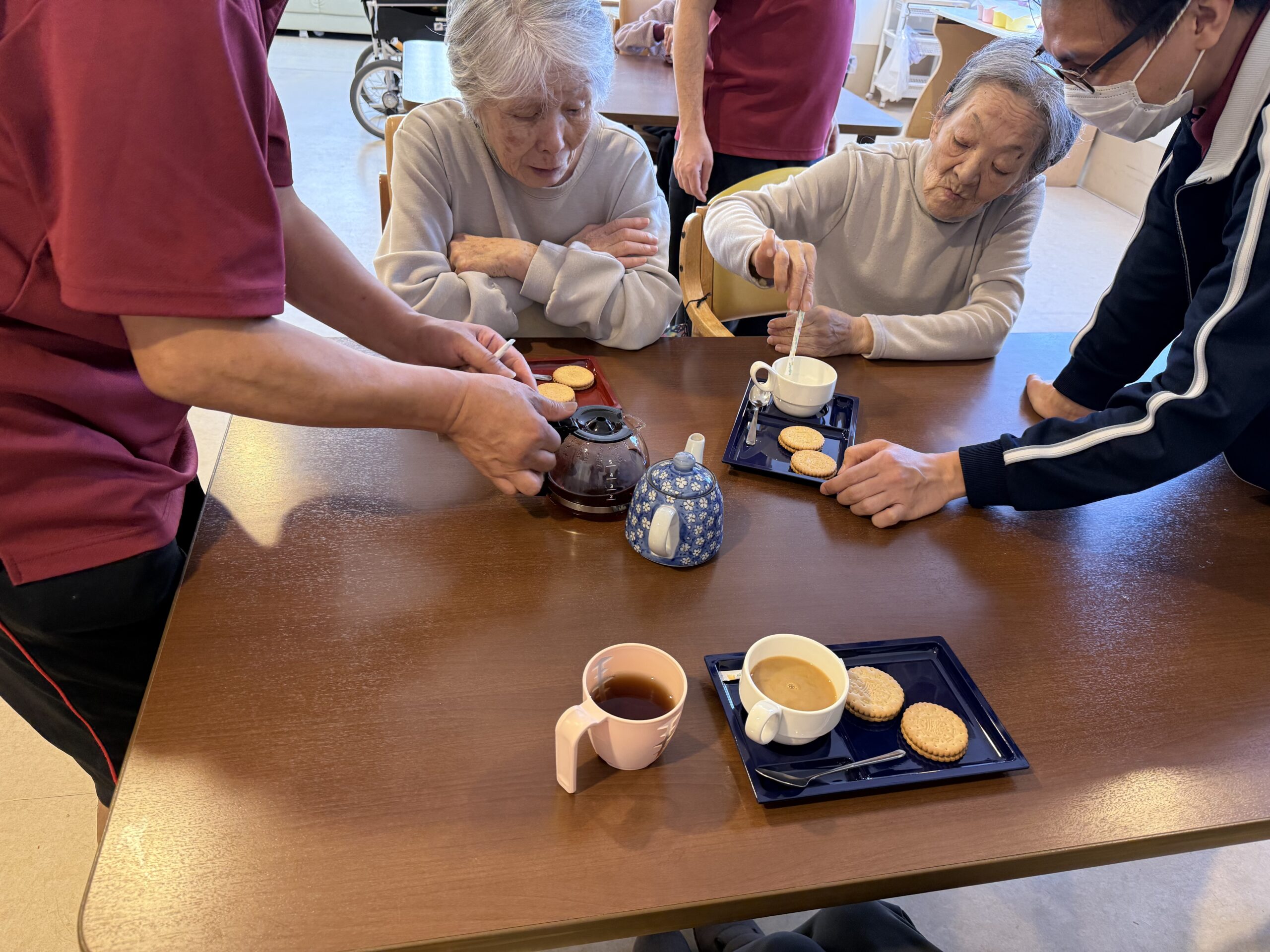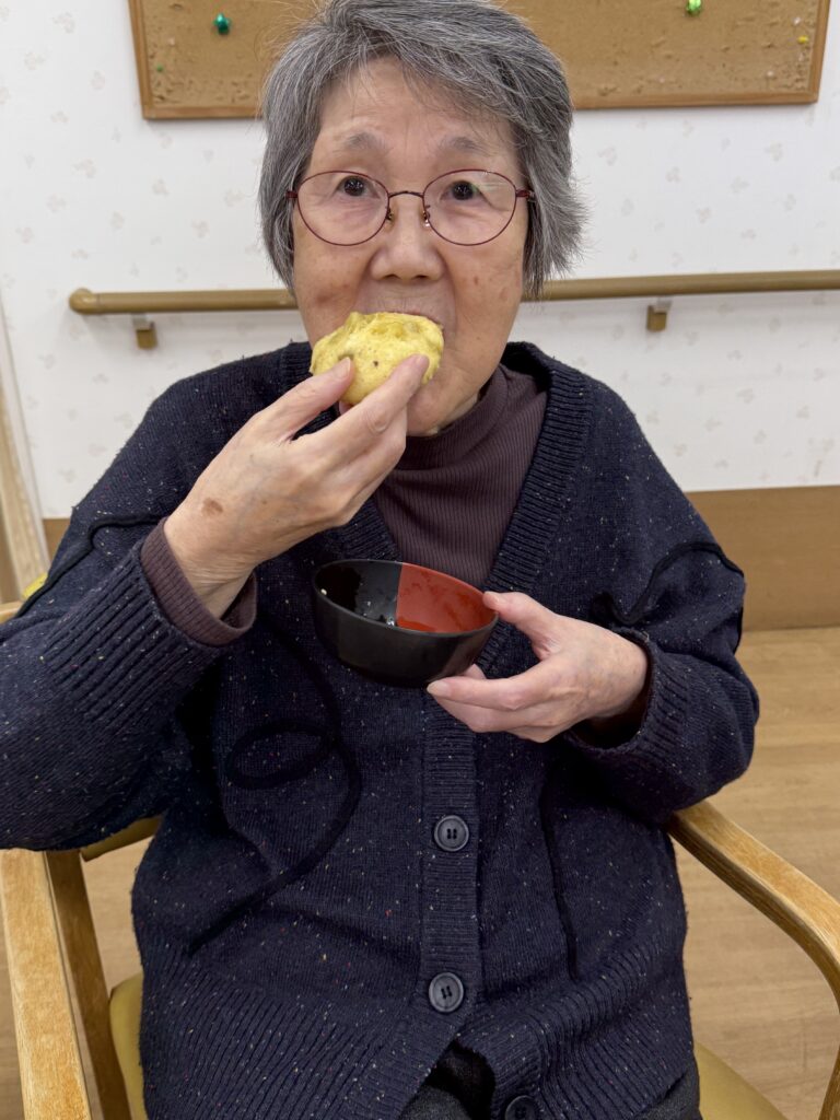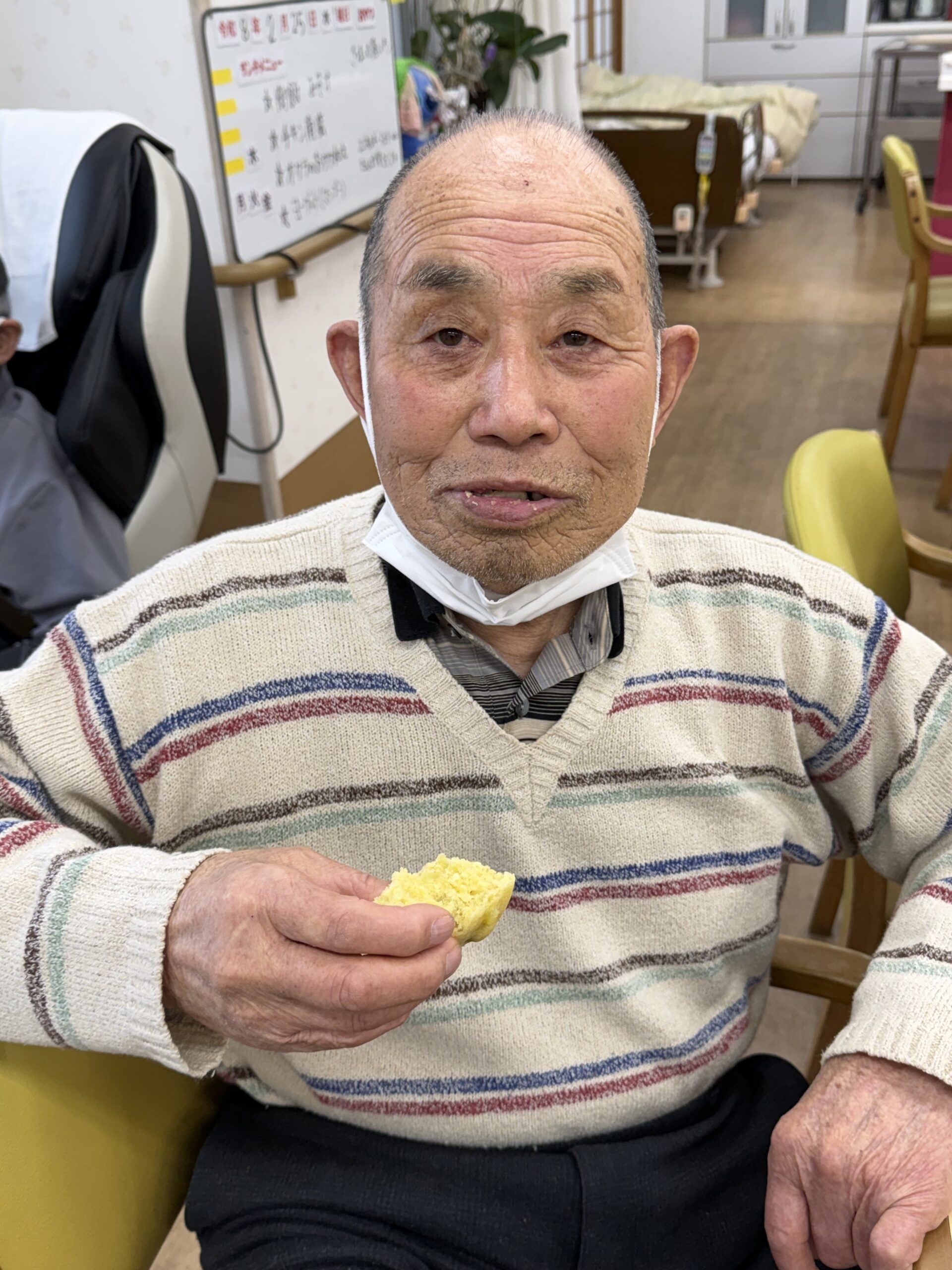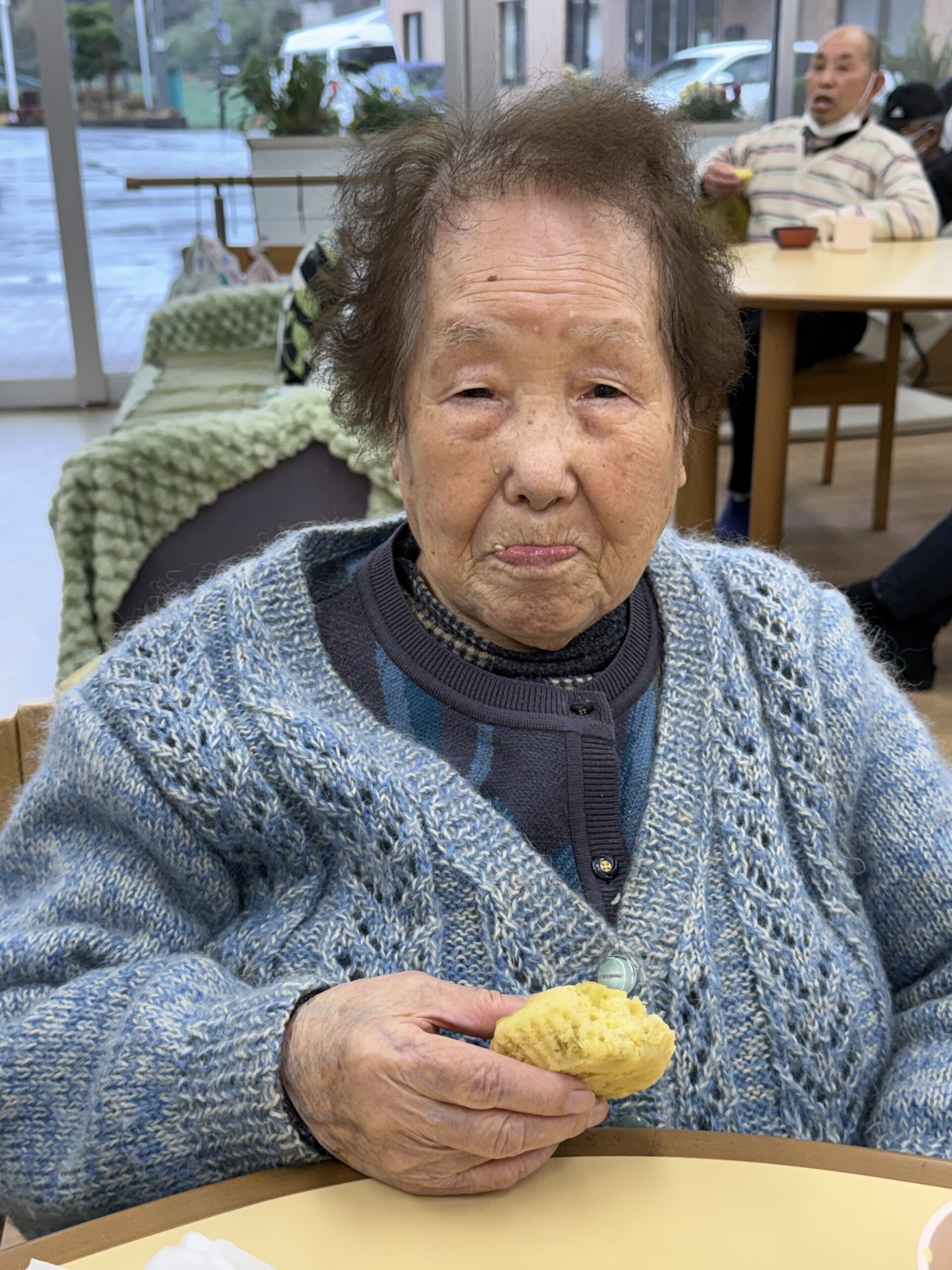 デイサービス事業所のアーブル・ヴェールでは毎日、手作りおやつをご提供しています。今日は、お芋の蒸しパンです。お芋がゴロゴロ入ったボリューム満点のホクホクの甘い蒸しパンに、皆さま「おいしい」「おいしい!」「やさしい甘さだね」「昔よく作ったのを思い出すわ」と、自然と笑顔がこぼれました。蒸したてのあたたかさと、お芋のほくほく食感に、皆さま大満足のご様子でした。