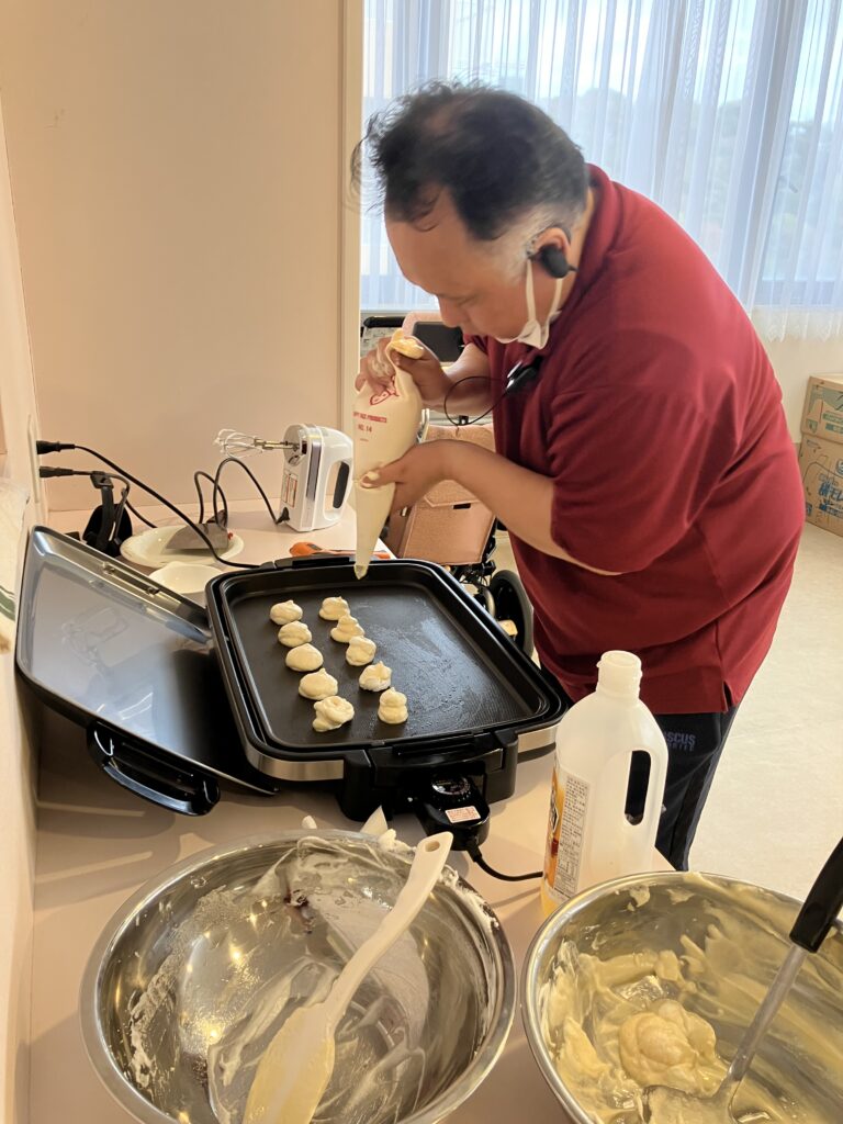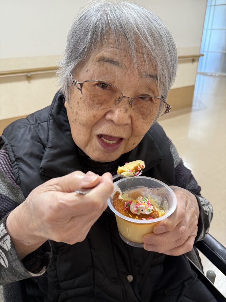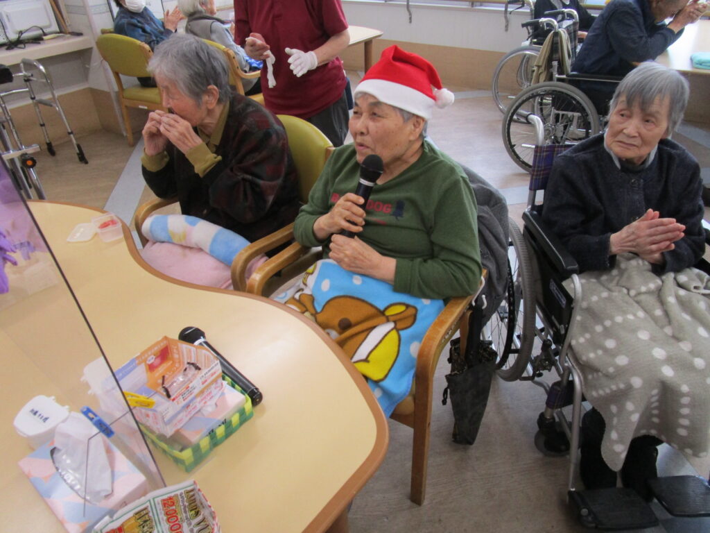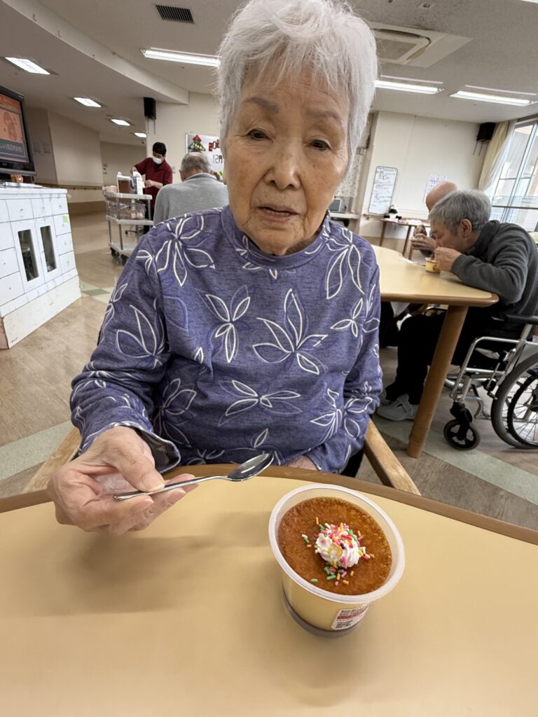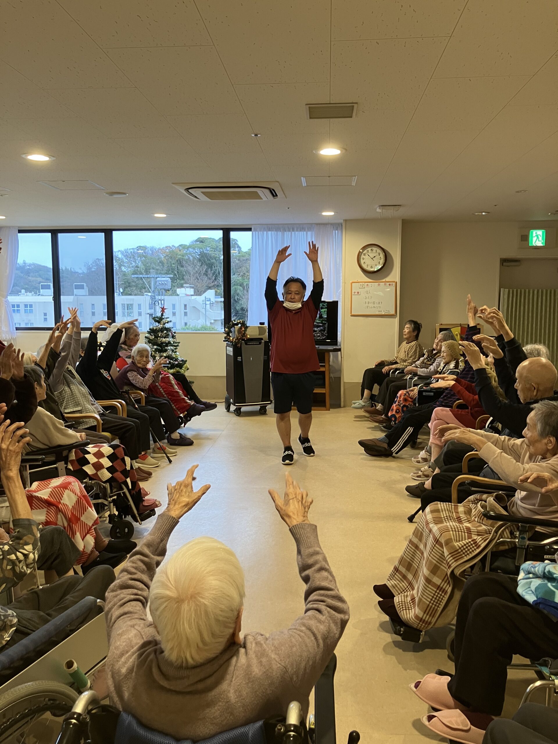 クリスマス会を開催しました!!今回は、手づくりケーキに挑戦しました。生地を焼くところから一緒に行い、オリジナルパンケーキが完成しました。甘い香りに包まれながら、「おいしそうだね」「きれいにできたね」と会話も弾み、笑顔あふれるひとときとなりました。また、食後はカラオケ大会にエクササイズと盛り上がっていました。